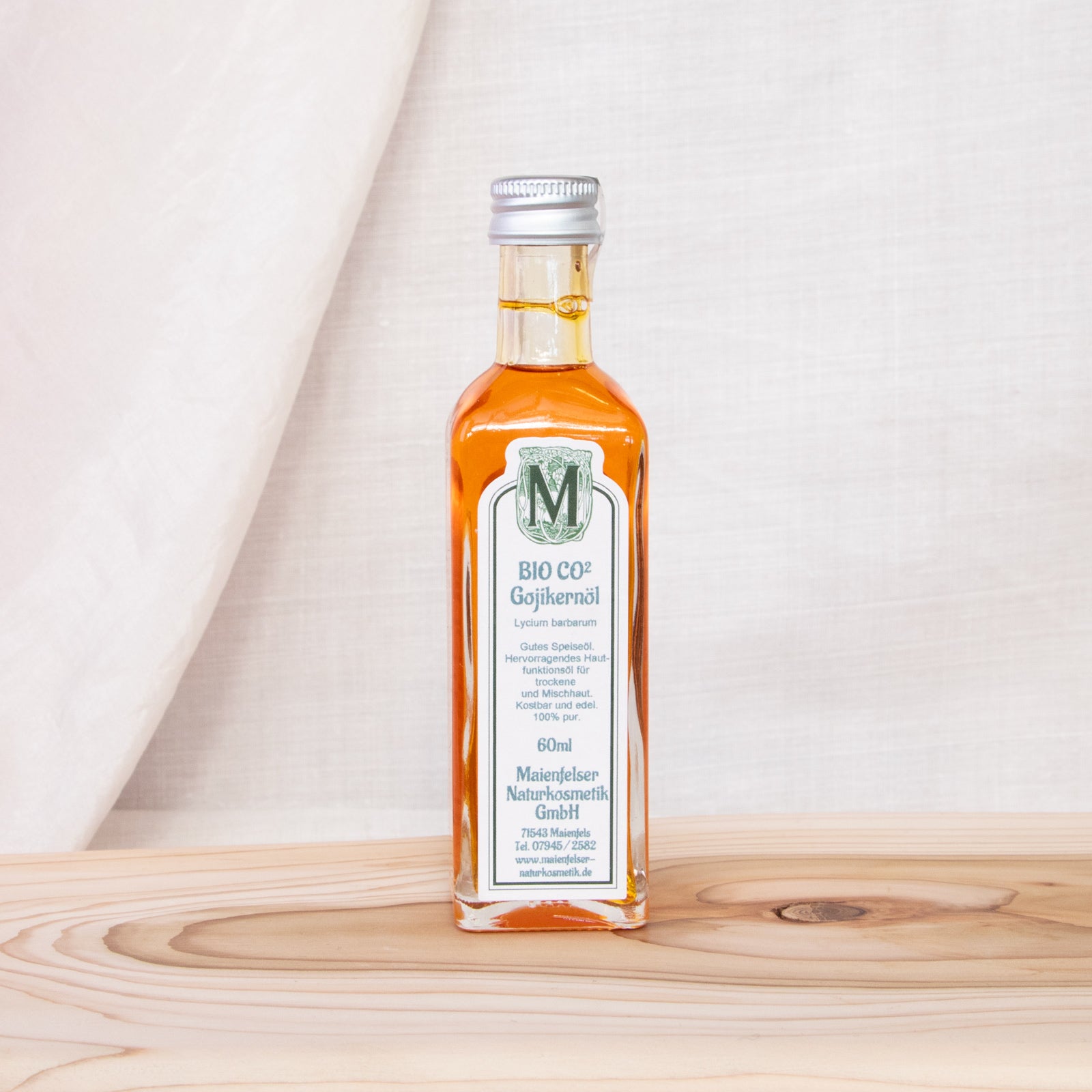 Kosmetische Verwendung: Durch den hohen Anteil an ungesättigter Linolsäure ein hervorragendes Hautfunktionsöl. Auch die gamma-Linolensäure und die sekundären Pflanzenstoffe mit über 3 % stellen das orange-gelbe Gojikernöl in die höhere Kategorie. Es ist sowohl für trockene empfindliche wie auch für Mischhaut bestens geeignet. Ein sehr kostbares, edles Hautöl.