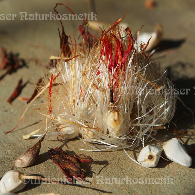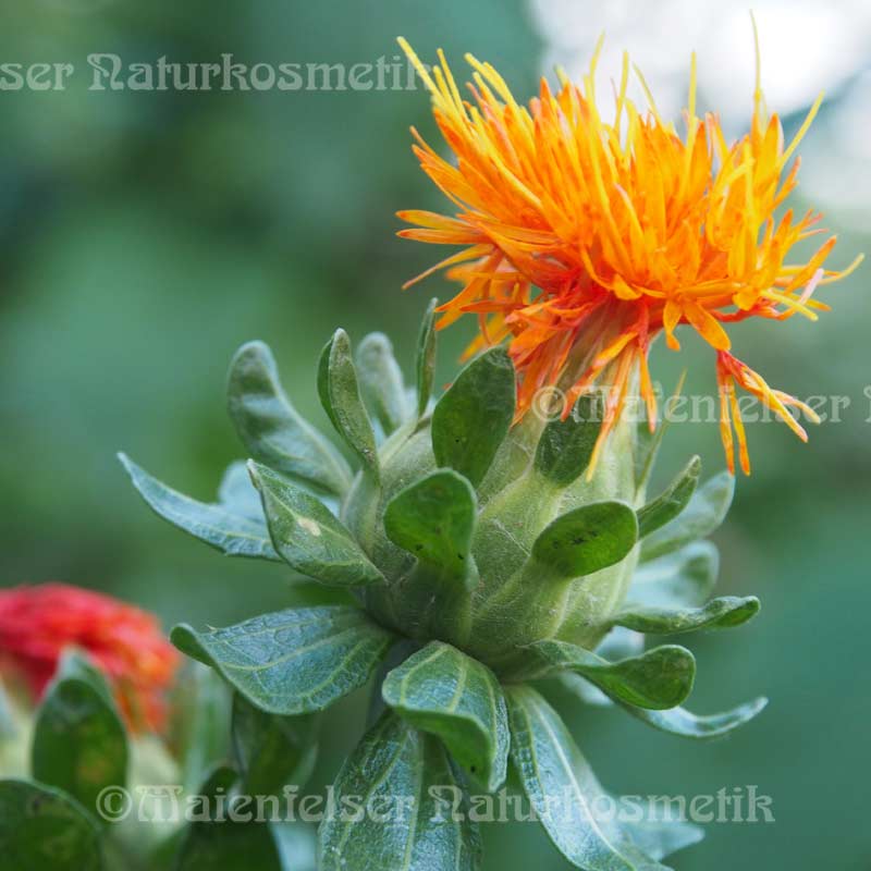 Aus den Blüten der Saflor-Distel, deren gepresstes Samenöl im kulinarischen Bereich eingesetzt wird. Die Blüten sind auch als traditioneller Pflanzenfarbstoff bei den Einheimischen beliebt (Färberdistel). Weicher, sehr schöner aromatischer Duft.