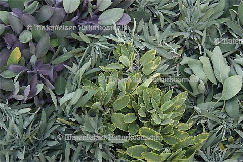 Aus unserem Bergkräutergarten haben wir Ihnen eine Komposition aus verschiedenen Salbeiarten zusammengestellt. Da gibts welche mit roten Blättern, blau-grünen Blättern, spitz-oval, kleinblättrig – ein regelrechtes Sammelsurium aus der großen Salbeifamilie. Und jede Destillation ist wieder anders durch die unterschiedlichen Anteile der verschiedenen Salbeiarten. Angenehmer Salbeiduft - man spürt die Vielfalt der Sorten.