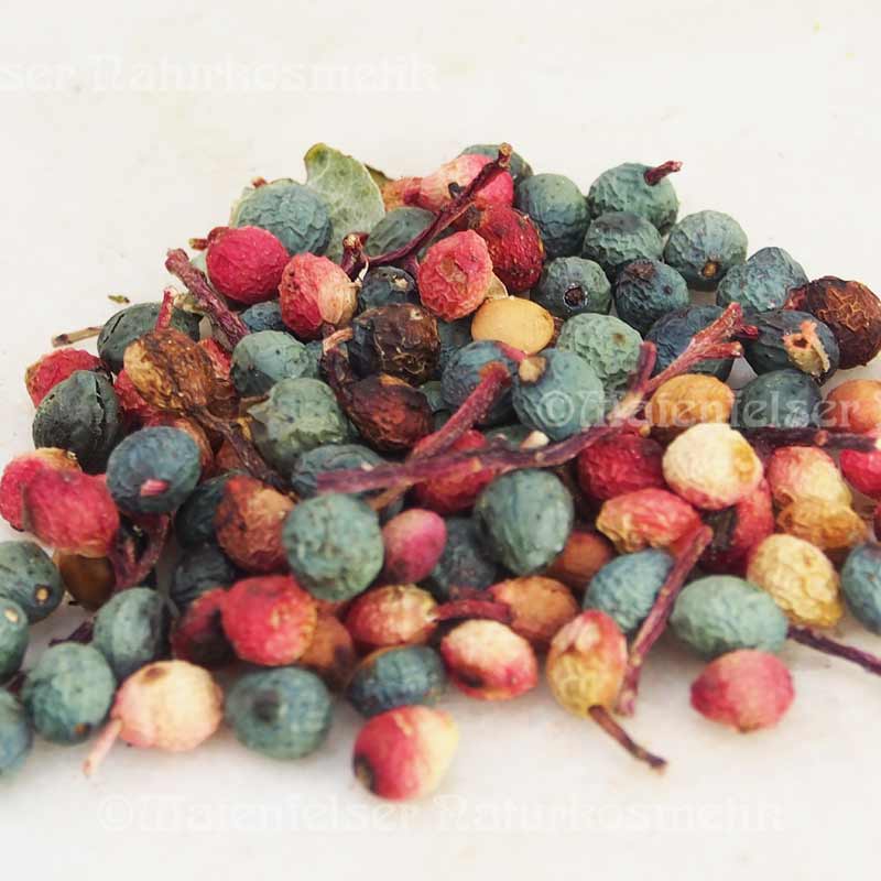 Mit einer bunten Farbenvielfalt überraschen die Terpentinbeeren von einer anderen Stammpflanze. Sowohl zum Würzen (wagen Sie es ruhig einmal - Pfannkuchen, Gebäck etc.) wie auch zum Räuchern eignen sich diese bunten Terpentinbeeren. Von blau bis rot ist die ganze Farbenpracht vorhanden. Sehr gut auch zum dekorieren im kulinarischen Bereich oder in bunten Räuchermischungen.